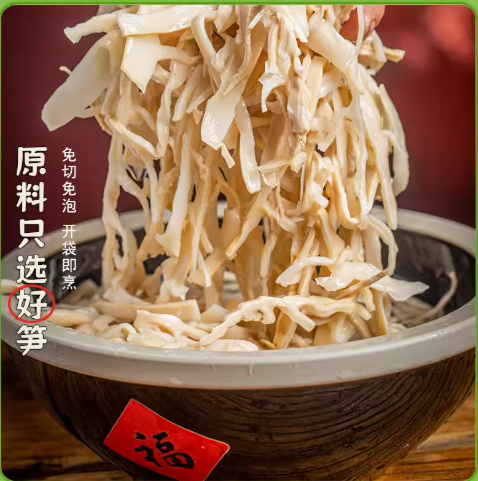 这款笋尖最具特色的亮点,便是传承了湖南本地数十年的古法糯米笋工艺,经过浸泡、蒸煮、晾晒、腌制等多道繁琐工序精心炮制,每一道工序都凝聚着老匠人的匠心,全程手工操作,拒绝机械流水线的粗糙处理。其中,糯米浸泡环节尤为关键,选用本地优质糯米,提前浸泡24小时至软糯,再与竹笋一同蒸煮,让糯米的清甜与竹笋的鲜香深度融合,既去除了竹笋中的粗纤维杂质,让口感更显细腻,又牢牢锁住了春笋最原始的鲜嫩质感,还赋予了笋尖淡淡的糯米回甘。打开包装袋的瞬间,浓郁醇厚的竹笋清香便会扑面而来,瞬间唤醒味蕾;入口更是极致的脆爽弹牙,咀嚼时清脆有声,口感紧实却不柴硬,细细品味,先是竹笋的鲜爽在口腔中蔓延,随后便是一丝淡淡的糯米回甘萦绕舌尖,口感层次丰富,不柴不绵、不涩不腻,每一口都能让人感受到食材本身的纯粹与治愈。更贴心的是,笋尖已提前切成均匀细腻的竹笋丝,无需额外清洗、切配,省去了处理新鲜竹笋时去壳、焯水、切丝的繁琐步骤,无论是直接开袋即食,还是搭配肉类、蔬菜翻炒,亦或是用来凉拌、煲汤、做馅料,都能轻松上手,妥妥的懒人厨房必备好物,让忙碌的上班族、新手宝妈也能在几分钟内搞定一餐美味,轻松享受地道湖南风味。