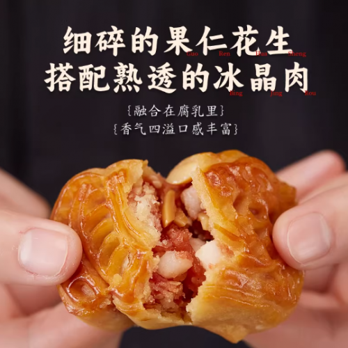 入口之后的滋味,更是一场层次递进、回味悠长的味觉盛宴。初尝时,饼皮的酥松干爽感在齿间化开,质地轻盈不粘牙、不噎口,带着淡淡的麦香打底;轻轻咬开后,内馅的柔润感便顺势蔓延开来,腌制到位的糖肉丁释放出温润的脂香,与红腐乳独有的咸鲜风味交织缠绕,口感绵密又不失质感。与此同时,花生与芝麻的颗粒感在齿间轻轻爆开,带来清脆的咀嚼体验,每一口都能感受到食材的本真香气,尾调还萦绕着高粱白酒的淡淡醇烈与柠檬的清新回甘,甜咸平衡得恰到好处,既没有甜腻糕点的齁感,也没有传统咸点的厚重,肥而不腻、咸鲜适口,越嚼越能品出食材交融的精妙滋味。这种独特风味适配多种场景,搭配潮汕工夫茶时,能消解饼的醇厚,让茶香与饼香相互映衬;作为下午茶的能量补给,能快速缓解疲惫,带来味蕾满足;日常追剧、朋友小聚时当作休闲零食,也能凭借不俗口感成为全场焦点,老幼皆宜的风味特质,让不同年龄段的人都能沉醉其中,吃过之后便念念不忘。