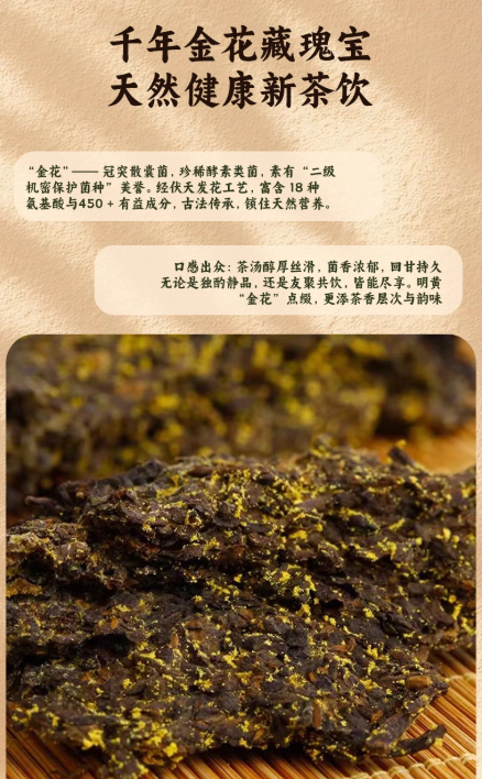 这 “金花”,便是泾阳茯茶的灵魂所在,其学名为冠突散囊菌,是一种对人体有益的益生菌群,也是茯茶区别于其他黑茶的核心标志。现代科学研究表明,金花中富含多种活性成分,不仅能提升茶汤的香气与口感,还能帮助调节肠胃功能,这也是泾阳茯茶 “解腻消食、暖身养胃” 口碑的科学依据。泾昌盛品牌深谙金花培育的奥秘,从源头便严苛把控原料品质,甄选云南大叶种晒青毛茶 —— 这种茶叶茶多酚、儿茶素含量高,为金花生长与茶汤醇厚口感奠定了坚实基础。在制作过程中,品牌恪守 “采、制、发、陈” 四大古法工序,每一步都倾注匠心:筛选茶叶时,人工剔除碎末、杂质,确保原料纯净;杀青环节采用传统铁锅炒制,火候由经验丰富的茶师凭手感与嗅觉把控,既保留茶叶的本味,又破坏酶的活性;揉捻时力道均匀,让茶叶细胞壁充分破裂,利于后续发酵;渥堆发酵阶段,茶师会根据天气变化调整堆温与湿度,让茶叶在微生物的作用下缓慢转化;最后,茶叶被压制成砖,送入泾阳传统地窖中自然陈化 —— 这些地窖多建于明清时期,内壁布满了岁月沉淀的微生物,茶叶在这里静静沉睡,少则数年,多则十余年,金花在茶砖内部悄然生长,从最初的细小斑点,逐渐变得金黄饱满、分布均匀,仿佛给茶砖披上了一层 “金纱”。